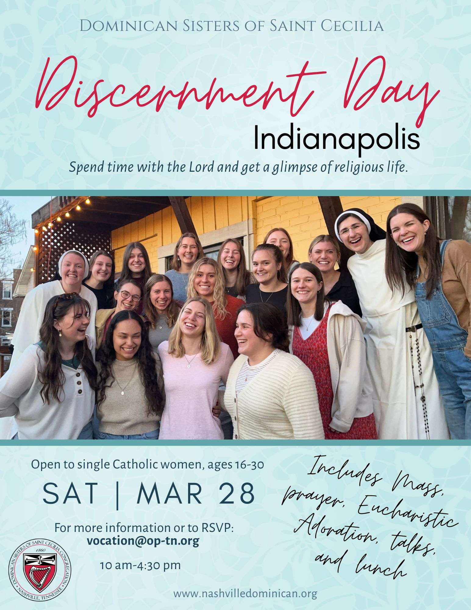 The Dominican Sisters of St. Cecilia are hosting a discernment retreat day on Saturday, March 28th from 10am - 4:30pm at Our Lady of Mount Carmel Church in Carmel, IN. This invitation is open to all Catholic women ages 16-30.